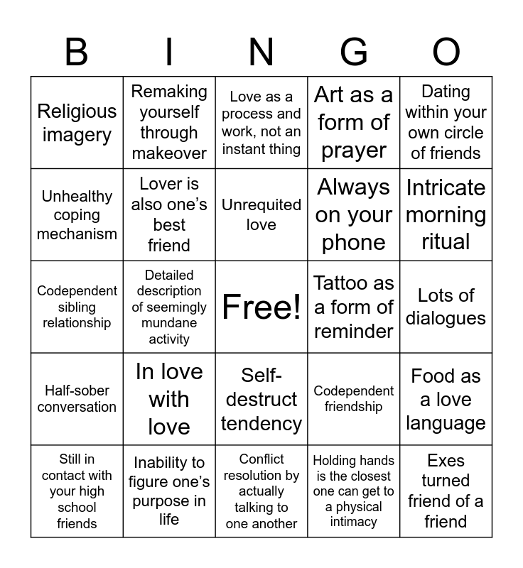 This bingo card has a free space and 24 words: In love with love, Inability to figure one’s purpose in life, Unrequited love, Still in contact with your high school friends, Dating within your own circle of friends, Religious imagery, Unhealthy coping mechanism, Remaking yourself through makeover, Tattoo as a form of reminder, Self-destruct tendency, Always on your phone, Codependent sibling relationship, Codependent friendship, Food as a love language, Lover is also one’s best friend, Holding hands is the closest one can get to a physical intimacy, Lots of dialogues, Love as a process and work, not an instant thing, Intricate morning ritual, Detailed description of seemingly mundane activity, Exes turned friend of a friend, Half-sober conversation, Art as a form of prayer and Conflict resolution by actually talking to one another.