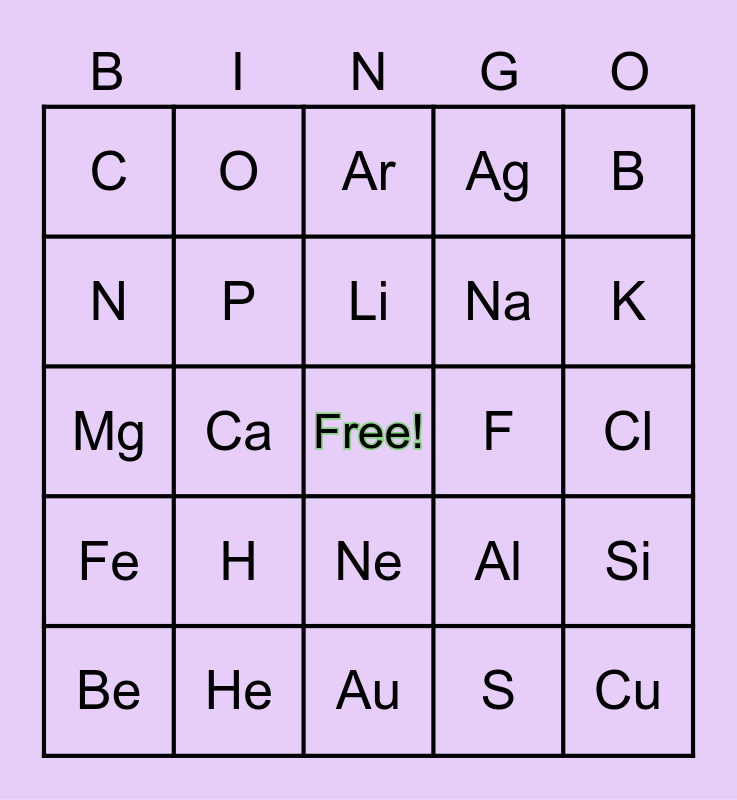 This bingo card has a free space and 24 words: H, He, Li, Be, B, C, N, O, F, Ne, Na, Mg, Al, Si, P, S, Cl, Ar, K, Ca, Cu, Fe, Ag and Au.