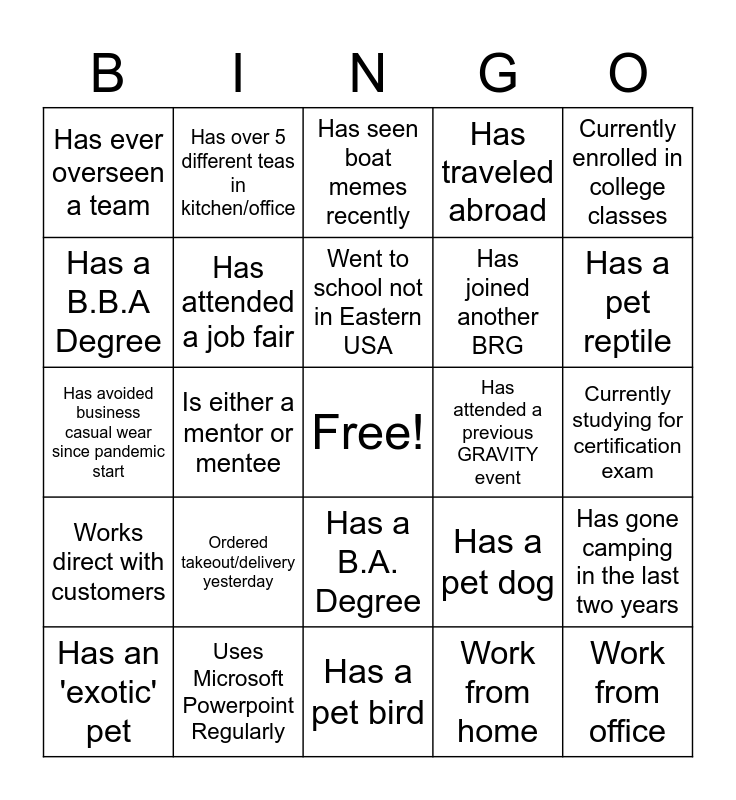 This bingo card has a free space and 40 words: Used Slack in the last week, Has avoided business casual wear since pandemic start, Grew up in a different timezone than currently living, Has attended a job fair, Uses Microsoft Powerpoint Regularly, Has a B.A. Degree, Went to school not in Eastern USA, Uses Microsoft Excel Regularly, Currently enrolled in college classes, Works direct with customers, Is either a mentor or mentee, Has traveled abroad, Work from office, Currently studying for certification exam, Has attended a previous GRAVITY event, Ordered takeout/delivery yesterday, Has the word 'Engineer' in job title, Has ever overseen a team, Has a B.S. Degree, Has seen boat memes recently, Has gone camping in the last two years, Work from home, Has joined another BRG, Has a B.B.A Degree, Works a typical 9-5, Find someone who likes snow, Works in a cubicle, Works in an office, Went to school in Eastern USA, Find someone who doesn't work at your location, Find someone who is in their first job, Has an 'exotic' pet, Has a pet cat, Has a pet dog, Has a pet reptile, Has a pet bird, Has a pet fish, Drinks more than one cup of coffee a day, Has over 5 different teas in kitchen/office and Find someone who has at least one dose of the COVID vaccine.