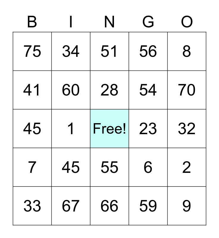 This bingo card has a free space and 24 words: 45, 67, 28, 33, 8, 75, 41, 34, 23, 55, 54, 45, 6, 2, 60, 59, 32, 51, 70, 1, 9, 7, 56 and 66.