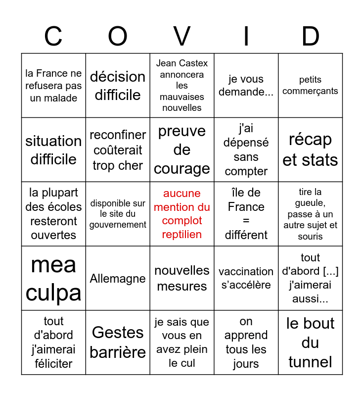 This bingo card has a free space and 24 words: Allemagne, Gestes barrière, preuve de courage, tout d'abord j'aimerai féliciter, petits commerçants, la France ne refusera pas un malade, situation difficile, décision difficile, île de France = différent, nouvelles mesures, j'ai dépensé sans compter, la plupart des écoles resteront ouvertes, vaccination s’accélère, tout d'abord [...] j'aimerai aussi..., reconfiner coûterait trop cher, on apprend tous les jours, tire la gueule, passe à un autre sujet et souris, Jean Castex annoncera les mauvaises nouvelles, récap et stats, disponible sur le site du gouvernement, le bout du tunnel, mea culpa, je vous demande... and je sais que vous en avez plein le cul.