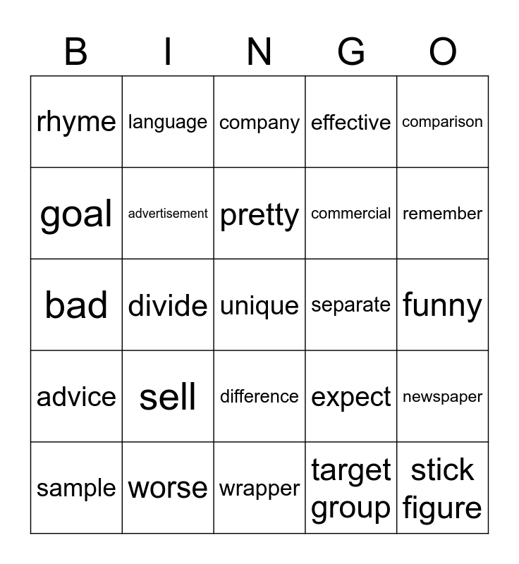 This bingo card has 40 words: to broadcast, bad, buyer, advertisement, worse, difference, pretty, driveway, comparison, advice, divide, effective, unique, funny, separate, sell, image, rhyme, tension, company, newspaper, target group, commercial, goal, present, factory, inventor, artist, stick figure, important, outline, sample, phrase, expect, remember, wrapper, approach, silly, language and bar.