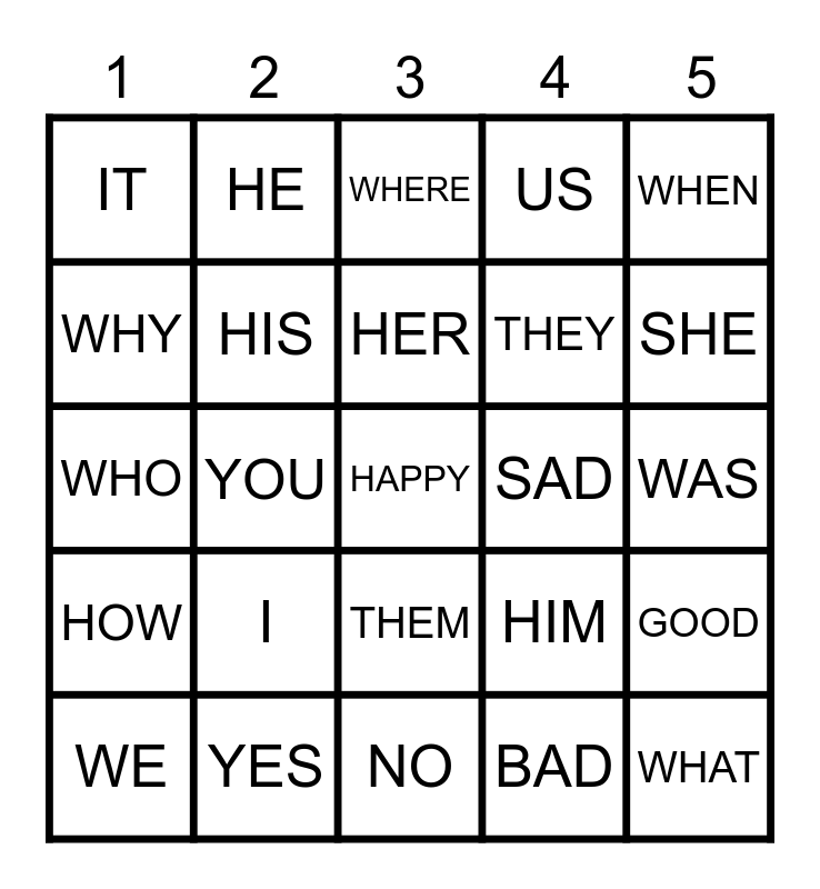 This bingo card has a free space and 24 words: I, YES, HER, WE, WHEN, IT, WHY, HE, SAD, THEM, THEY, WHO, HIM, GOOD, HIS, BAD, WAS, WHERE, SHE, YOU, WHAT, HOW, US and NO.