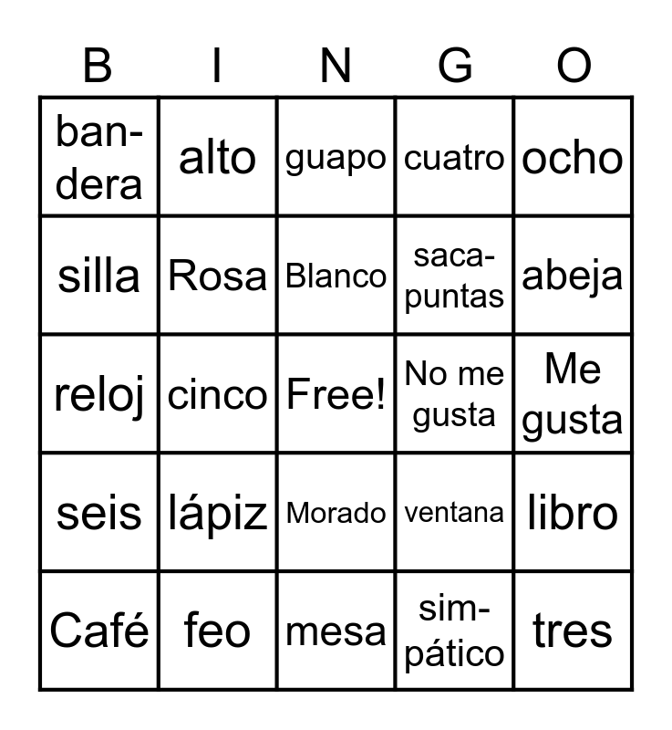 This bingo card has a free space and 39 words: Azúl, Verde, Ama-rillo, Rosa, Café, Morado, Blanco, Rojo, ocho, seis, cinco, cuatro, tres, Me gusta, No me gusta, lápiz, piza-rrón, ban-dera, puerta, ventana, silla, mesa, saca-puntas, abeja, zapato, queso, estrella, oso, ballena, alto, bajo, gordito, guapo, feo, sim-pático, papel, libro, reloj and man-zana.