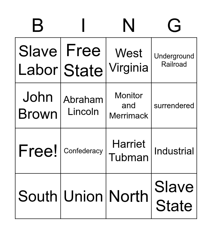 This bingo card has 20 words: South, Appomattox Courthouse, West Virginia, Industrial, Agricultural, Confederacy, North, Underground Railroad, Free!, Free State, Harriet Tubman, surrendered, Slave Labor, Union, Monitor and Merrimack, Nat Turner, John Brown, Abraham Lincoln, abolitionists and Slave State.