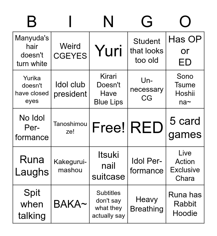 This bingo card has a free space and 24 words: Kakegurui-mashou, BAKA~, Kirari Doesn't Have Blue Lips, Spit when talking, Has OP or ED, Manyuda's hair doesn't turn white, Yurika doesn't have closed eyes, Weird CGEYES, RED, Itsuki nail suitcase, Un-necessary CG, No Idol Per-formance, Idol Per-formance, Live Action Exclusive Chara, Idol club president, Heavy Breathing, 5 card games, Yuri, Sono Tsume Hoshii na~, Tanoshimou ze!, Runa has Rabbit Hoodie, Runa Laughs, Student that looks too old and Subtitles don't say what they actually say.