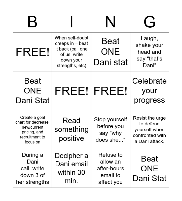 This bingo card has 16 words: Decipher a Dani email within 30 min., Resist the urge to defend yourself when confronted with a Dani attack., Beat ONE Dani stat, FREE!, Create a goal chart for decrease, new/current pricing, and recruitment to focus on, When self-doubt creeps in – beat it back (call one of us, write down your strengths, etc), Stop yourself before you say "why does she...", Refuse to allow an after-hours email to affect you, Beat ONE Dani Stat, FREE!, During a Dani call..write down 3 of her strengths, Laugh, shake your head and say “that’s Dani”, Read something positive, Celebrate your progress, FREE! and Beat ONE Dani Stat.