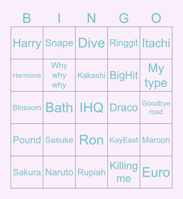 This bingo card has a free space and 24 words: Sasuke, Naruto, Kakashi, Sakura, Itachi, Harry, Harmione, Snape, Draco, Ron, BigHit, Blossom, KayEast, Maroon, Why why why, Killing me, Goodbye road, Dive, My type, Bath, Euro, Pound, Ringgit and Rupiah.
