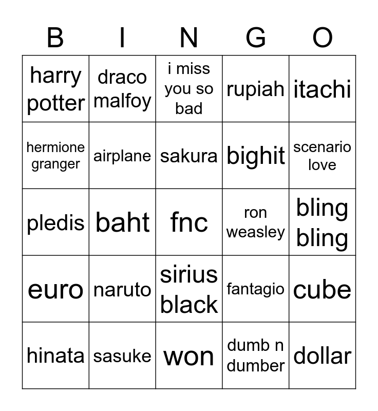 This bingo card has a free space and 24 words: naruto, sasuke, sakura, hinata, itachi, harry potter, hermione granger, draco malfoy, ron weasley, sirius black, bighit, pledis, fantagio, cube, airplane, dumb n dumber, bling bling, i miss you so bad, scenario love, baht, dollar, euro, rupiah and won.
