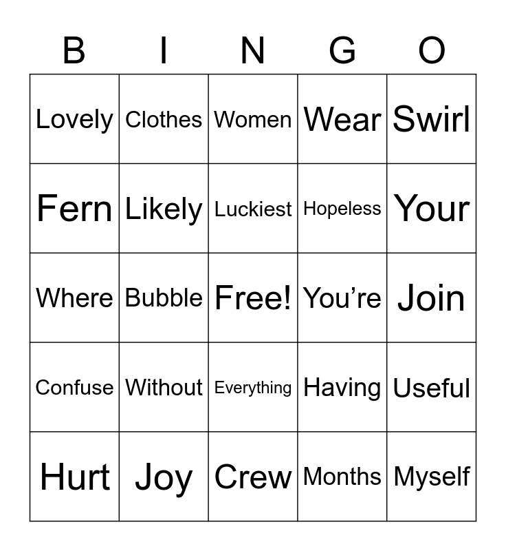 This bingo card has a free space and 24 words: Without, Joy, Luckiest, Hurt, Swirl, Lovely, Fern, Clothes, You’re, Everything, Hopeless, Where, Having, Useful, Likely, Months, Join, Women, Your, Bubble, Myself, Confuse, Wear and Crew.