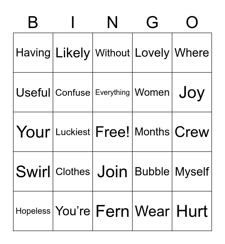 This bingo card has a free space and 24 words: Clothes, You’re, Everything, Hopeless, Where, Having, Useful, Likely, Months, Join, Women, Your, Bubble, Myself, Confuse, Wear, Crew, Without, Joy, Luckiest, Hurt, Swirl, Lovely and Fern.