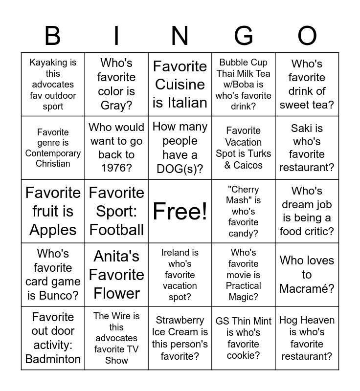 This bingo card has a free space and 24 words: Anita's Favorite Flower, The Wire is this advocates favorite TV Show, How many people have a DOG(s)?, Favorite out door activity: Badminton, Who's favorite drink of sweet tea?, Kayaking is this advocates fav outdoor sport, Favorite genre is Contemporary Christian, Who's favorite color is Gray?, "Cherry Mash" is who's favorite candy?, Ireland is who's favorite vacation spot?, Favorite Vacation Spot is Turks & Caicos, Favorite fruit is Apples, Who's favorite movie is Practical Magic?, Who loves to Macramé?, Who would want to go back to 1976?, GS Thin Mint is who's favorite cookie?, Who's dream job is being a food critic?, Favorite Cuisine is Italian, Saki is who's favorite restaurant?, Favorite Sport: Football, Hog Heaven is who's favorite restaurant?, Who's favorite card game is Bunco?, Bubble Cup Thai Milk Tea w/Boba is who's favorite drink? and Strawberry Ice Cream is this person's favorite?.