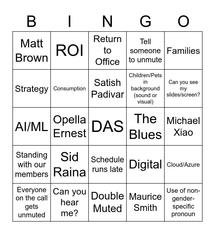 This bingo card has a free space and 27 words: Digital, Typing in the background, Children/Pets in background (sound or visual), Double Muted, Strategy, Return to Office, ROI, Standing with our members, The Blues, Cloud/Azure, AI/ML, Tell someone to unmute, Everyone on the call gets unmuted, Can you hear me?, Can you see my slides/screen?, Agile, Consumption, Satish Padivar, Sid Raina, Matt Brown, Michael Xiao, Maurice Smith, Opella Ernest, Use of non-gender-specific pronoun, Schedule runs late, Families and Momentum.