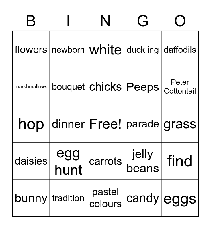 This bingo card has a free space and 39 words: April, basket, bonnet, bouquet, bunny, carrots, chicks, chocolate, daffodils, daisies, dinner, duckling, eggs, grass, parade, egg hunt, egg toss, flowers, garden, jelly beans, marshmallows, pastel colours, Peeps, Peter Cottontail, rabbit, holiday, springtime, tulips, lamb, newborn, green, yellow, white, tradition, candy, decorate, find, hop and lily.