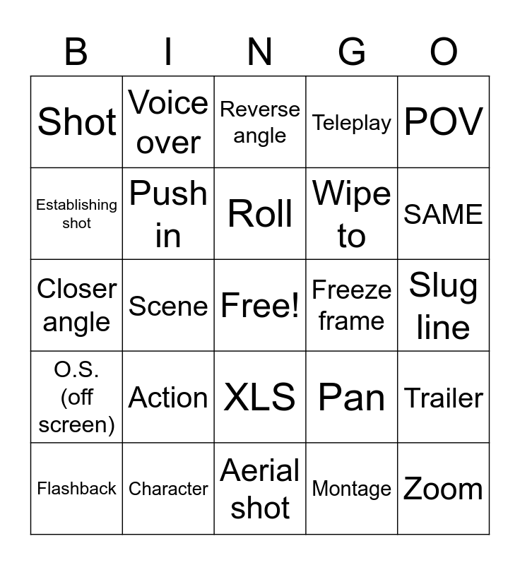 This bingo card has a free space and 24 words: Action, Character, Roll, Flashback, POV, Shot, Establishing shot, Voice over, Freeze frame, XLS, Wipe to, Closer angle, Pan, Trailer, Push in, Montage, Slug line, Reverse angle, SAME, Scene, Zoom, O.S. (off screen), Teleplay and Aerial shot.