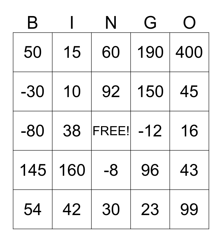 This bingo card has a free space and 24 words: 160, 42, 92, 54, 400, 50, -30, 15, -12, -8, 150, -80, 96, 43, 10, 23, 16, 60, 45, 38, 99, 145, 190 and 30.