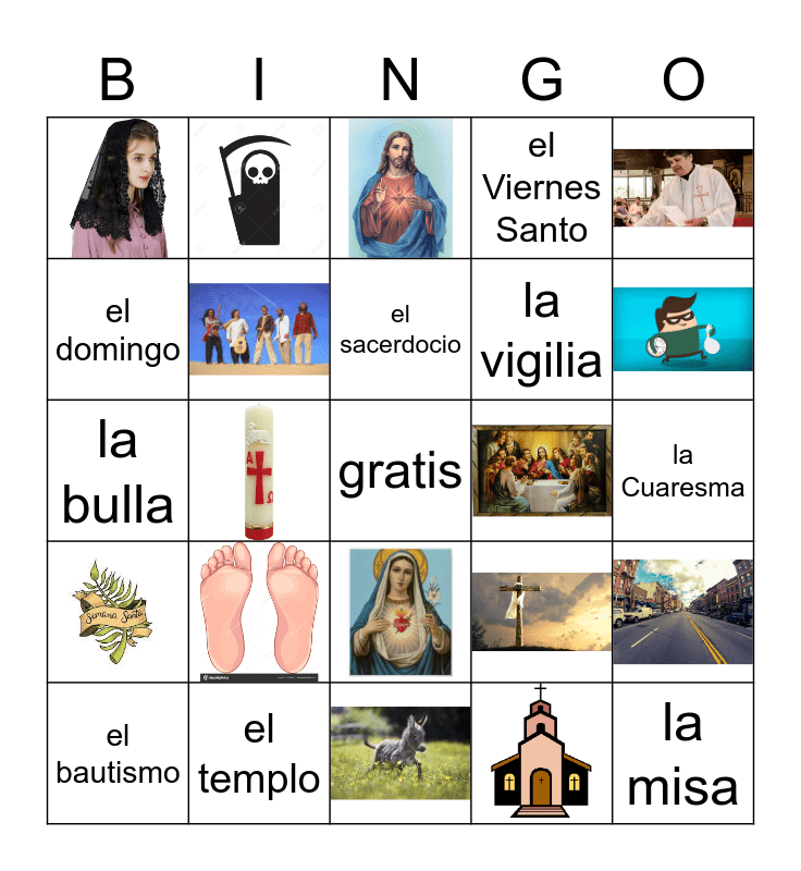 This bingo card has 18 images, a free space and 13 words: la Cuaresma, la misa, la Pascua, el Espíritu, cenar, el bautismo, la vigilia, el domingo, el Viernes Santo, la bulla, el templo, el sacerdocio and el Triduo.
