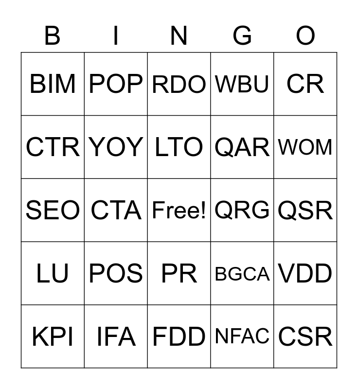 This bingo card has a free space and 24 words: POS, IFA, LTO, KPI, CR, BIM, CTR, POP, QRG, PR, QAR, SEO, BGCA, VDD, YOY, NFAC, QSR, RDO, WOM, CTA, CSR, LU, WBU and FDD.
