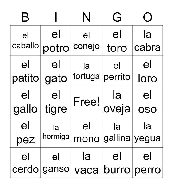 This bingo card has a free space and 29 words: el cerdo, el sapo, el tigre, el elefante, el caballo, el conejo, el gato, la hormiga, la oveja, el ganso, el oso, el perro, la vaca, el burro, el loro, el pato, el mono, el pez, la cabra, el gallo, la gallina, el gatito, el perrito, el patito, el toro, el potro, la yegua, la tortuga and el rinocerante.