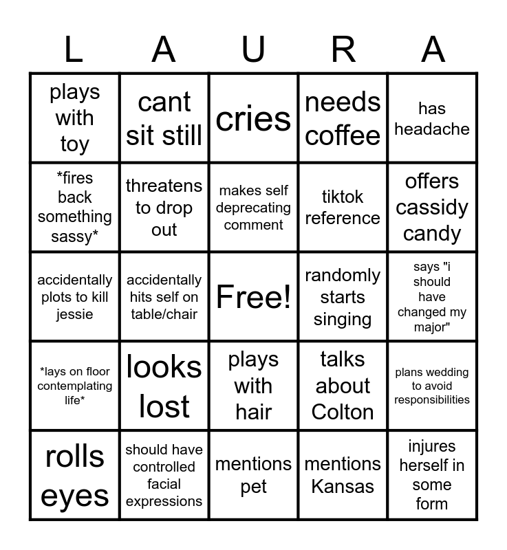 This bingo card has a free space and 24 words: looks lost, should have controlled facial expressions, makes self deprecating comment, rolls eyes, has headache, plays with toy, *fires back something sassy*, cant sit still, randomly starts singing, plays with hair, tiktok reference, accidentally plots to kill jessie, talks about Colton, plans wedding to avoid responsibilities, threatens to drop out, mentions Kansas, says "i should have changed my major", cries, offers cassidy candy, accidentally hits self on table/chair, injures herself in some form, *lays on floor contemplating life*, needs coffee and mentions pet.
