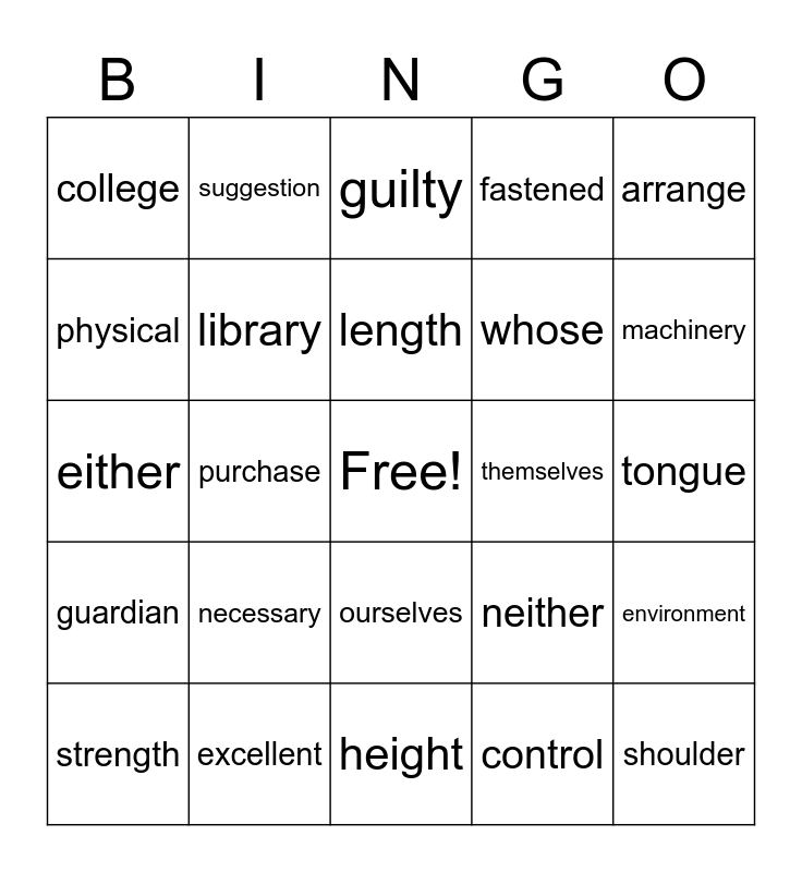 This bingo card has a free space and 24 words: necessary, excellent, length, strength, arrange, college, physical, suggestion, themselves, ourselves, whose, either, neither, environment, library, control, tongue, guilty, machinery, purchase, shoulder, guardian, fastened and height.