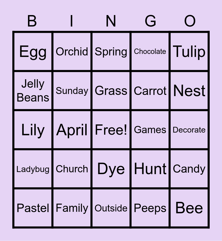 This bingo card has a free space and 35 words: Bunny, Basket, Easter, Sunday, Dye, Chocolate, Jelly Beans, Flowers, Grass, Daffodil, Lily, Tulip, Chick, Lamb, Egg, Games, Peeps, April, Ladybug, Bee, Hunt, Pastel, Candy, Family, Spring, Nest, Bonnet, Hop, Carrot, Decorate, Holiday, Outside, Church, Orchid and Parade.