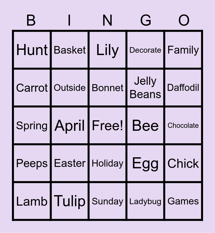 This bingo card has a free space and 35 words: Parade, Orchid, Church, Outside, Holiday, Decorate, Carrot, Hop, Bonnet, Nest, Spring, Family, Candy, Pastel, Hunt, Bee, Ladybug, April, Peeps, Games, Egg, Lamb, Chick, Tulip, Lily, Daffodil, Grass, Flowers, Jelly Beans, Chocolate, Dye, Sunday, Easter, Basket and Bunny.