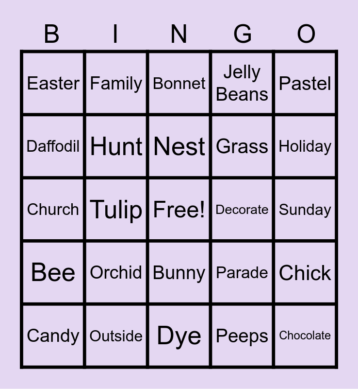 This bingo card has a free space and 34 words: Games, Peeps, April, Ladybug, Bee, Hunt, Pastel, Candy, Family, Spring, Nest, Bonnet, Hop, Carrot, Decorate, Holiday, Outside, Church, Orchid, Parade, Bunny, Basket, Easter, Sunday, Dye, Chocolate, Jelly Beans, Flowers, Grass, Daffodil, Lily, Tulip, Chick and Lamb Egg.