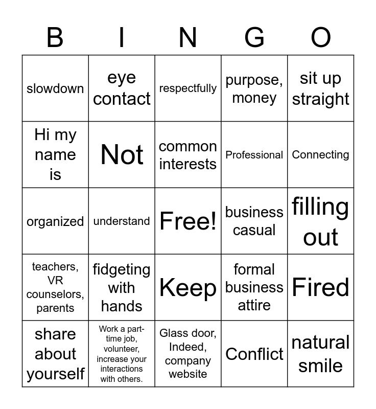 This bingo card has a free space and 24 words: fidgeting with hands, Work a part-time job, volunteer, increase your interactions with others., common interests, share about yourself, sit up straight, slowdown, Hi my name is, eye contact, business casual, Keep, Professional, organized, formal business attire, Fired, Not, Conflict, filling out, respectfully, Connecting, understand, natural smile, teachers, VR counselors, parents, purpose, money and Glass door, Indeed, company website.