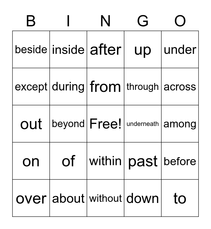 This bingo card has a free space and 24 words: of, about, from, over, under, beside, except, inside, underneath, within, through, out, past, before, during, down, among, after, across, beyond, to, on, up and without.