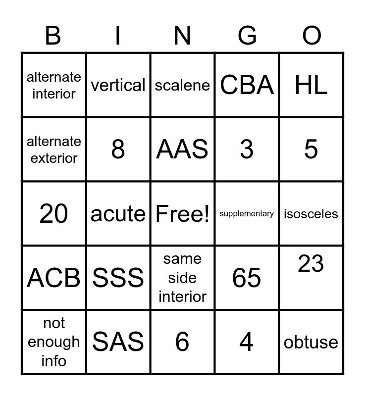 This bingo card has a free space and 24 words: SSS, SAS, AAS, not enough info, HL, alternate interior, alternate exterior, vertical, supplementary, same side interior, 3, 20, 65, 23, 8, 4, isosceles, scalene, 5, acute, obtuse, ACB, CBA and 6.