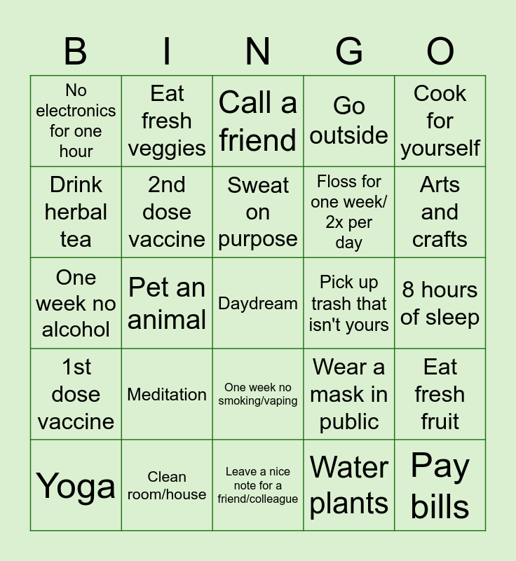 This bingo card has a free space and 32 words: Water plants, Bike ride, Pet an animal, Sing in the shower or car, 1st dose vaccine, 2nd dose vaccine, Cook for yourself, Eat fresh fruit, Eat fresh veggies, Drink 64 oz of water in one day, Sweat on purpose, Call a friend, Finish a project you've put off, Volunteer, Pick up trash that isn't yours, Recycle, Yoga, One week no alcohol, One week no smoking/vaping, Meditation, Wear a mask in public, Zoom party, 8 hours of sleep, Clean room/house, Pay bills, Go outside, Floss for one week/ 2x per day, Drink herbal tea, No electronics for one hour, Leave a nice note for a friend/colleague, Read for pleasure and Arts and crafts.