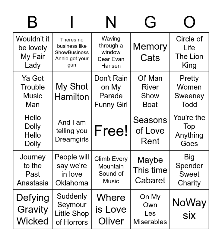 This bingo card has a free space and 29 words: Defying Gravity Wicked, All I ask of you The Phantom of the Opera, And I am telling you Dreamgirls, You can't stop the beat Hairspray, Wouldn't it be lovely My Fair Lady, Waving through a window Dear Evan Hansen, My Shot Hamilton, People will say we're in love Oklahoma, Seasons of Love Rent, Suddenly Seymour Little Shop of Horrors, You're the Top Anything Goes, NoWay six, Where is Love Oliver, On My Own Les Miserables, Pretty Women Sweeney Todd, The history of Wrong Guys Kinky Boots, Climb Every Mountain Sound of Music, Journey to the Past Anastasia, Circle of Life The Lion King, Hello Dolly Hello Dolly, Maybe This time Cabaret, Sit down you're rockin' the boat Guys and Dolls, Ol' Man River Show Boat, Ya Got Trouble Music Man, Memory Cats, Theres no business like ShowBusiness Annie get your gun, Big Spender Sweet Charity, Don't Rain on My Parade Funny Girl and Aquarius Hair.