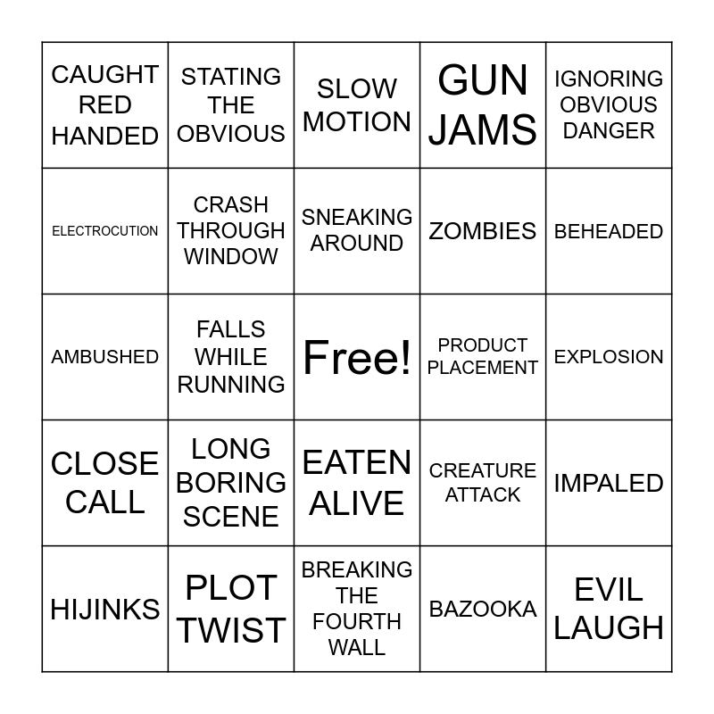 This bingo card has a free space and 24 words: LONG BORING SCENE, PLOT TWIST, SNEAKING AROUND, HIJINKS, IGNORING OBVIOUS DANGER, CAUGHT RED HANDED, ELECTROCUTION, STATING THE OBVIOUS, PRODUCT PLACEMENT, EATEN ALIVE, ZOMBIES, AMBUSHED, CREATURE ATTACK, IMPALED, CRASH THROUGH WINDOW, BAZOOKA, EXPLOSION, SLOW MOTION, BEHEADED, FALLS WHILE RUNNING, EVIL LAUGH, CLOSE CALL, GUN JAMS and BREAKING THE FOURTH WALL.