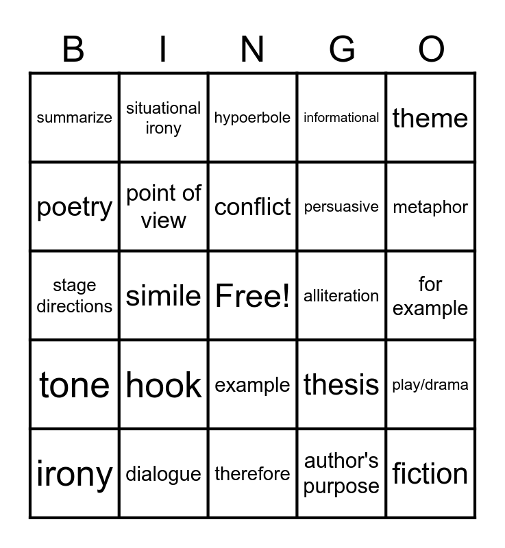 This bingo card has a free space and 33 words: flashback, foreshadowing, simile, imagery, tone, point of view, theme, irony, situational irony, dramatic irony, conflict, hypoerbole, mood, personification, alliteration, metaphor, dialogue, stage directions, hook, thesis, example, explain, summarize, for example, therefore, fiction, informational, persuasive, poetry, play/drama, inference, author's purpose and dictionary.