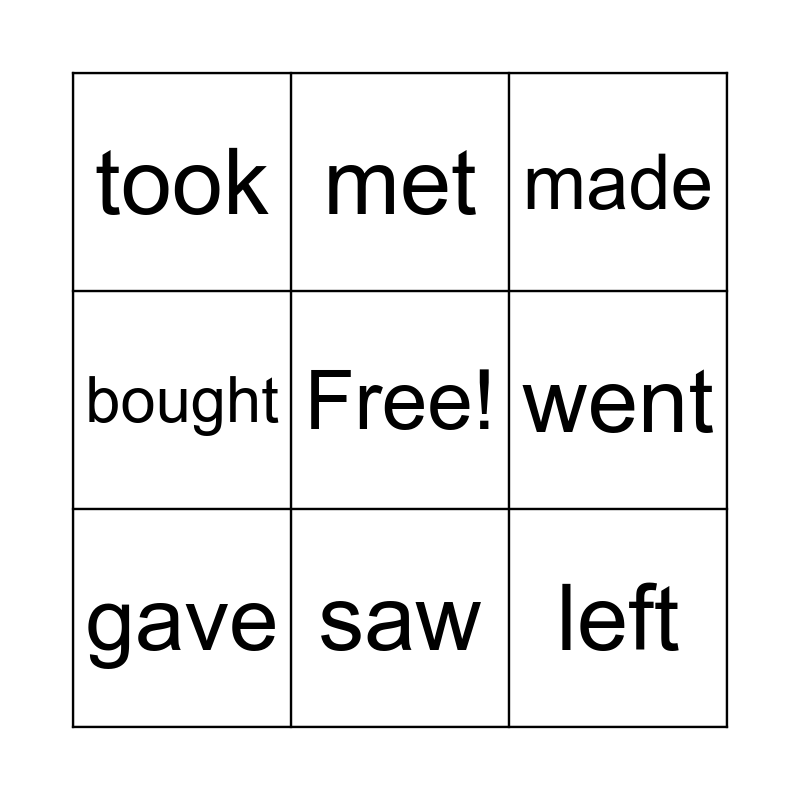 This bingo card has a free space and 8 words: went, made, met, gave, took, left, bought and saw.