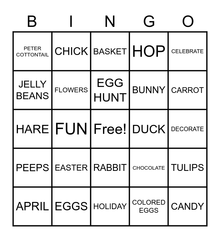 This bingo card has a free space and 24 words: EASTER, EGGS, EGG HUNT, APRIL, CELEBRATE, PETER COTTONTAIL, JELLY BEANS, CHICK, DUCK, RABBIT, BUNNY, HARE, CHOCOLATE, TULIPS, FLOWERS, COLORED EGGS, DECORATE, BASKET, CARROT, FUN, CANDY, PEEPS, HOP and HOLIDAY.