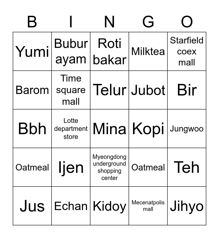 This bingo card has 25 words: Ijen, Kidoy, Telur, Jus, Starfield coex mall, Yumi, Barom, Bubur ayam, Kopi, Myeongdong underground shopping center, Jubot, Bbh, Oatmeal, Teh, Time square mall, Jihyo, Jungwoo, Roti bakar, Bir, Lotte department store, Mina, Echan, Oatmeal, Milktea and Mecenatpolis mall.