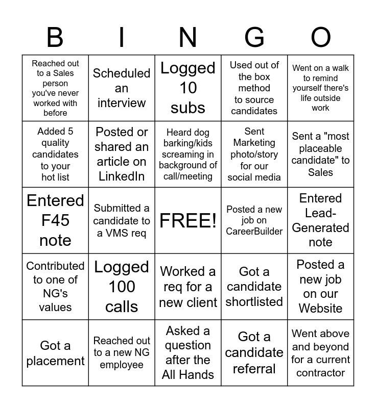 This bingo card has a free space and 24 words: Logged 100 calls, Reached out to a new NG employee, Heard dog barking/kids screaming in background of call/meeting, Got a placement, Went on a walk to remind yourself there's life outside work, Reached out to a Sales person you've never worked with before, Added 5 quality candidates to your hot list, Scheduled an interview, Posted a new job on CareerBuilder, Worked a req for a new client, Sent Marketing photo/story for our social media, Entered F45 note, Got a candidate shortlisted, Posted a new job on our Website, Posted or shared an article on LinkedIn, Got a candidate referral, Entered Lead-Generated note, Logged 10 subs, Sent a "most placeable candidate" to Sales, Submitted a candidate to a VMS req, Went above and beyond for a current contractor, Contributed to one of NG's values, Used out of the box method to source candidates and Asked a question after the All Hands.