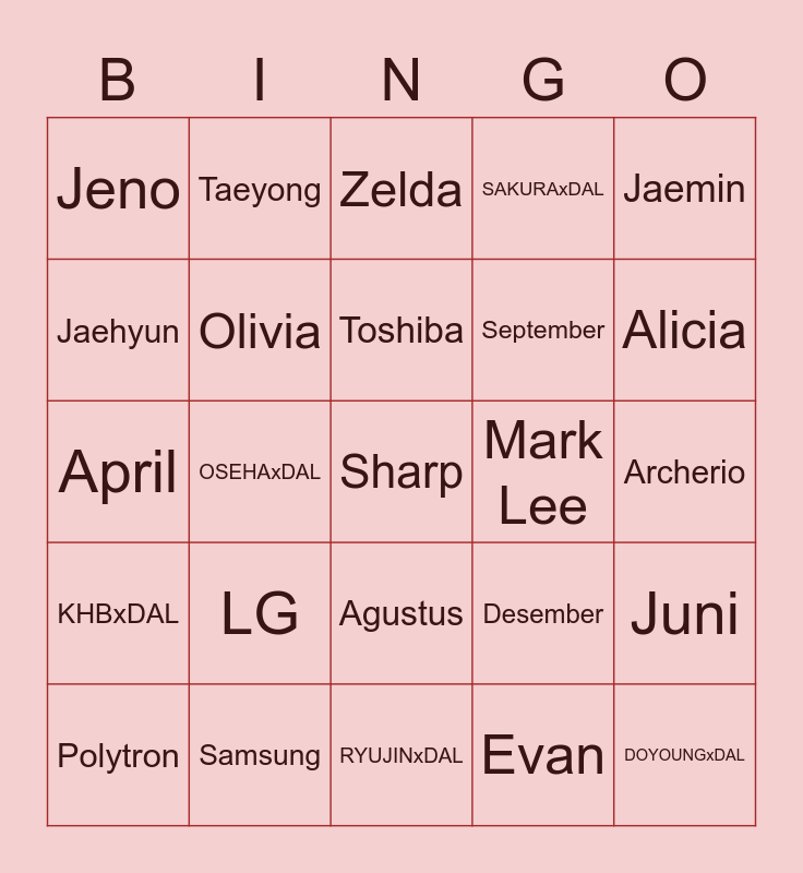 This bingo card has a free space and 24 words: LG, Samsung, Toshiba, Polytron, Jaemin, Jeno, Jaehyun, Taeyong, Mark Lee, Agustus, September, April, Desember, Juni, Olivia, Evan, Archerio, Zelda, Alicia, OSEHAxDAL, DOYOUNGxDAL, KHBxDAL, SAKURAxDAL and RYUJINxDAL.