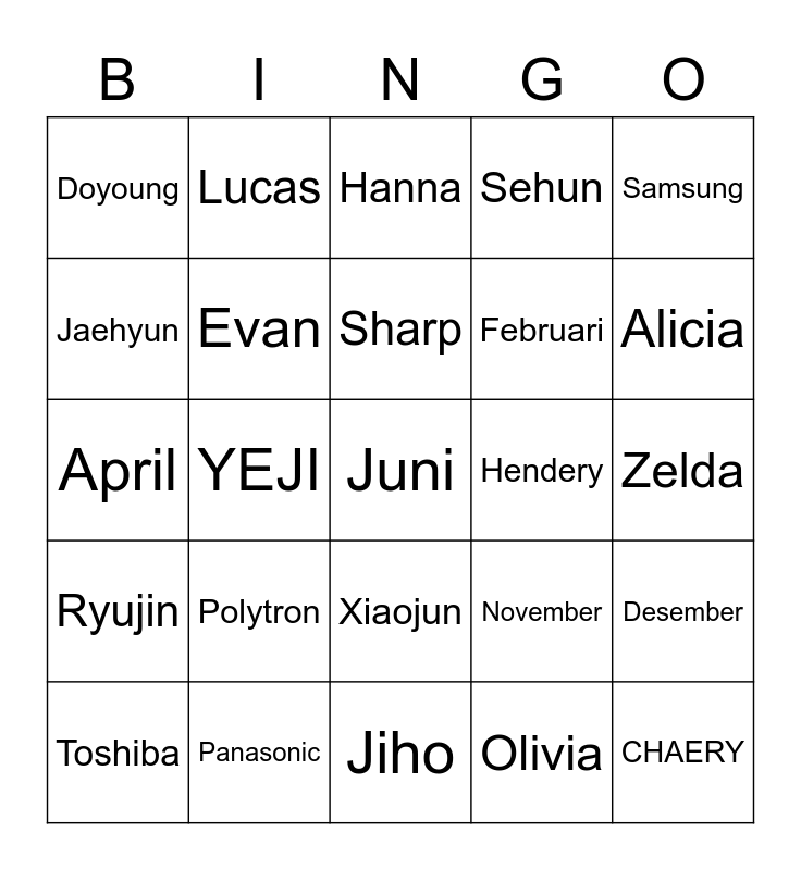 This bingo card has a free space and 24 words: Polytron, Panasonic, Sharp, Toshiba, Samsung, Doyoung, Jaehyun, Lucas, Hendery, Xiaojun, Februari, April, November, Desember, Evan, Olivia, Zelda, Hanna, Alicia, YEJI, CHAERY, Ryujin, Sehun and Jiho.