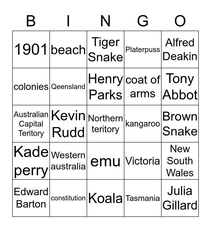 This bingo card has a free space and 24 words: Western australia, constitution, Henry Parks, Edward Barton, Alfred Deakin, 1901, colonies, beach, kangaroo, emu, coat of arms, Australian Capital Teritory, Victoria, New South Wales, Qeensland, Tasmania, Brown Snake, Tiger Snake, Tony Abbot, Kevin Rudd, Julia Gillard, Kade perry, Platerpuss and Koala.