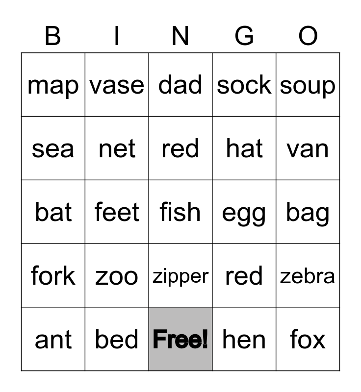 This bingo card has 25 words: fork, bed, fish, hen, soup, map, vase, dad, egg, zebra, sea, net, Free!, red, van, ant, feet, red, hat, bag, bat, zoo, zipper, sock and fox.