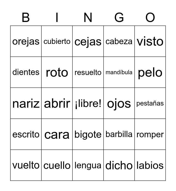 This bingo card has a free space and 34 words: abierto, dicho, hecho, puesto, escrito, roto, visto, vuelto, cubierto, muerto, resuelto, cejas, boca, mejillas, ojos, pelo, cuello, nariz, cara, barbilla, bigote, frente, orejas, pestañas, lengua, labios, cabeza, barba, mandíbula, dientes, pecas, abrir, romper and cubrir.