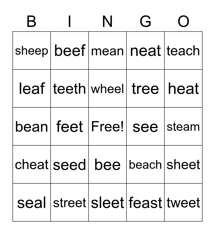 This bingo card has a free space and 25 words: seed, sleet, wheel, seal, teach, sheep, leaf, beef, see, bee, tree, bean, beach, sheet, teeth, green, steam, mean, heat, feet, tweet, street, cheat, neat and feast.