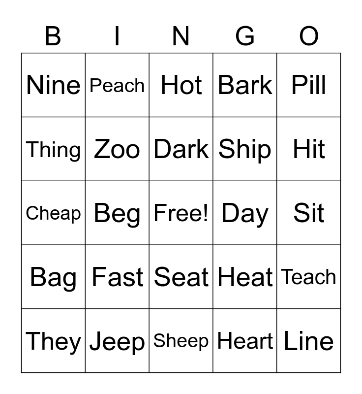 This bingo card has a free space and 29 words: They, Past, Beg, Sing, Nine, Hot, Zoo, Fast, Day, Jeep, Sit, Line, Sheep, Heart, Hit, Very, Seat, Bag, Pill, Cheap, Heat, Berry, Ship, Thing, Bark, Peach, Teach, Dark and Boo.