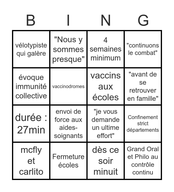 This bingo card has 16 words: Fermeture écoles, Confinement strict départements, 4 semaines minimum, vélotypiste qui galère, durée : 27min, "Nous y sommes presque", "je vous demande un ultime effort", dès ce soir minuit, évoque immunité collective, vaccinodromes, mcfly et carlito, "continuons le combat", envoi de force aux aides-soignants, "avant de se retrouver en famille", vaccins aux écoles and Grand Oral et Philo au contrôle continu.
