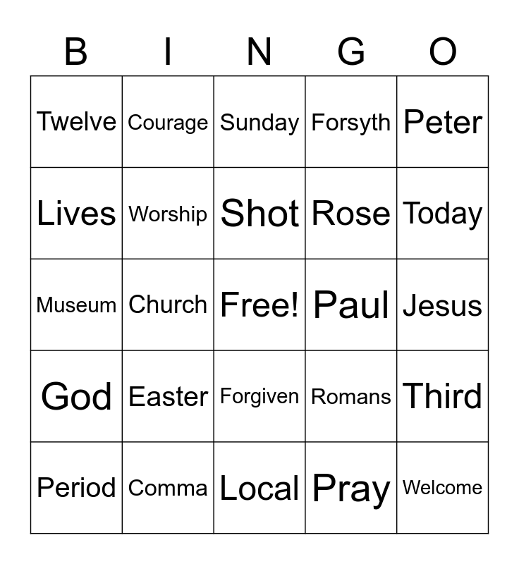 This bingo card has a free space and 24 words: Easter, Comma, Shot, Period, Peter, Twelve, Lives, Courage, Paul, Forgiven, Rose, Museum, Romans, Third, Worship, Pray, Jesus, Sunday, Today, Church, Welcome, God, Forsyth and Local.