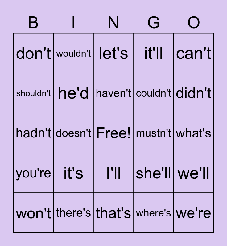 This bingo card has a free space and 24 words: it's, there's, haven't, won't, can't, don't, shouldn't, wouldn't, mustn't, I'll, couldn't, hadn't, she'll, we'll, he'd, where's, what's, let's, didn't, doesn't, we're, you're, it'll and that's.