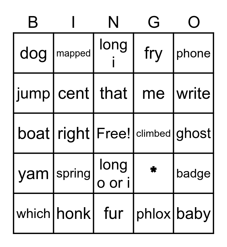 This bingo card has a free space and 24 words: spring, honk, that, which, phone, dog, jump, mapped, climbed, long o or i, me, boat, *, badge, cent, phlox, ghost, long i, write, right, baby, yam, fry and fur.